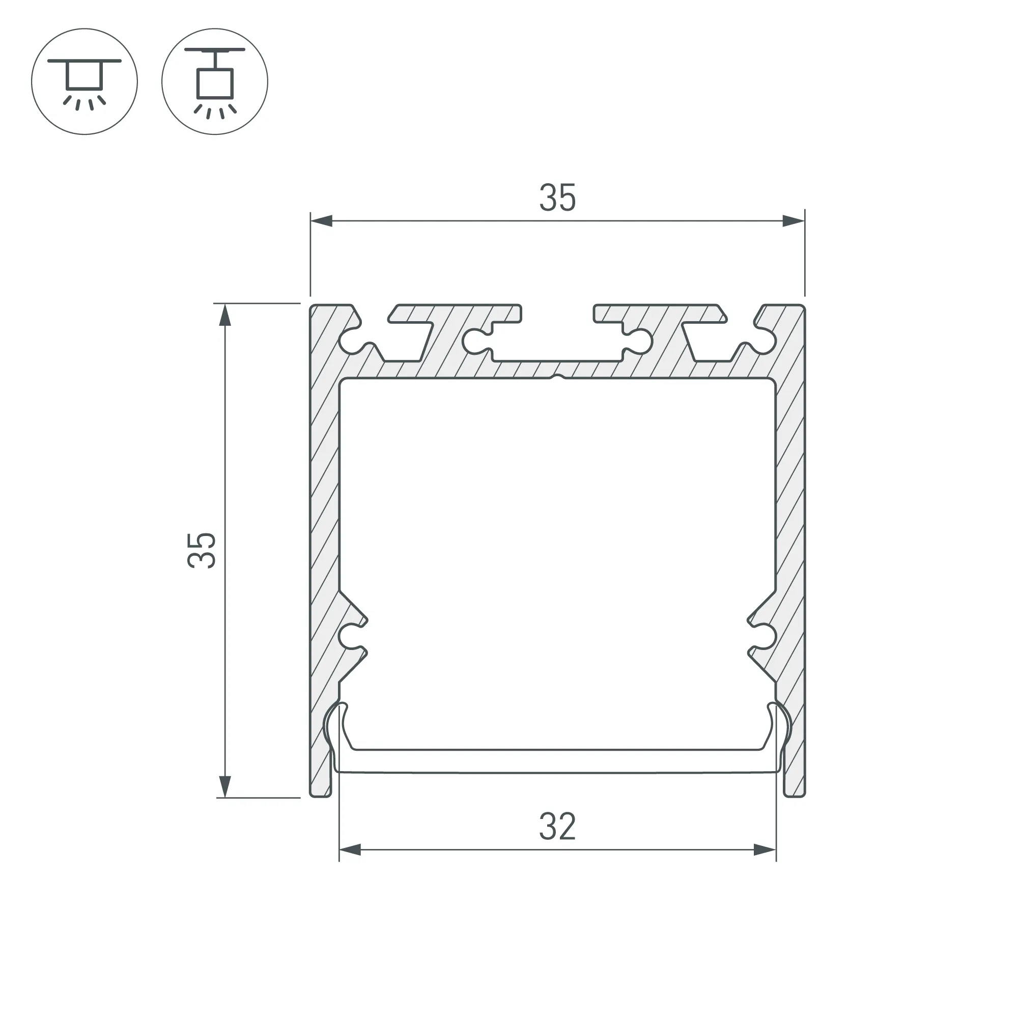 Комплект с экраном. Алюминиевый анодированный профиль для светодиодных лент и линеек. Габаритные размеры (L×W×H): 2500x35x35 мм. Ширина площадки для ленты 31 мм. Аксессуары приобретаются отдельно.