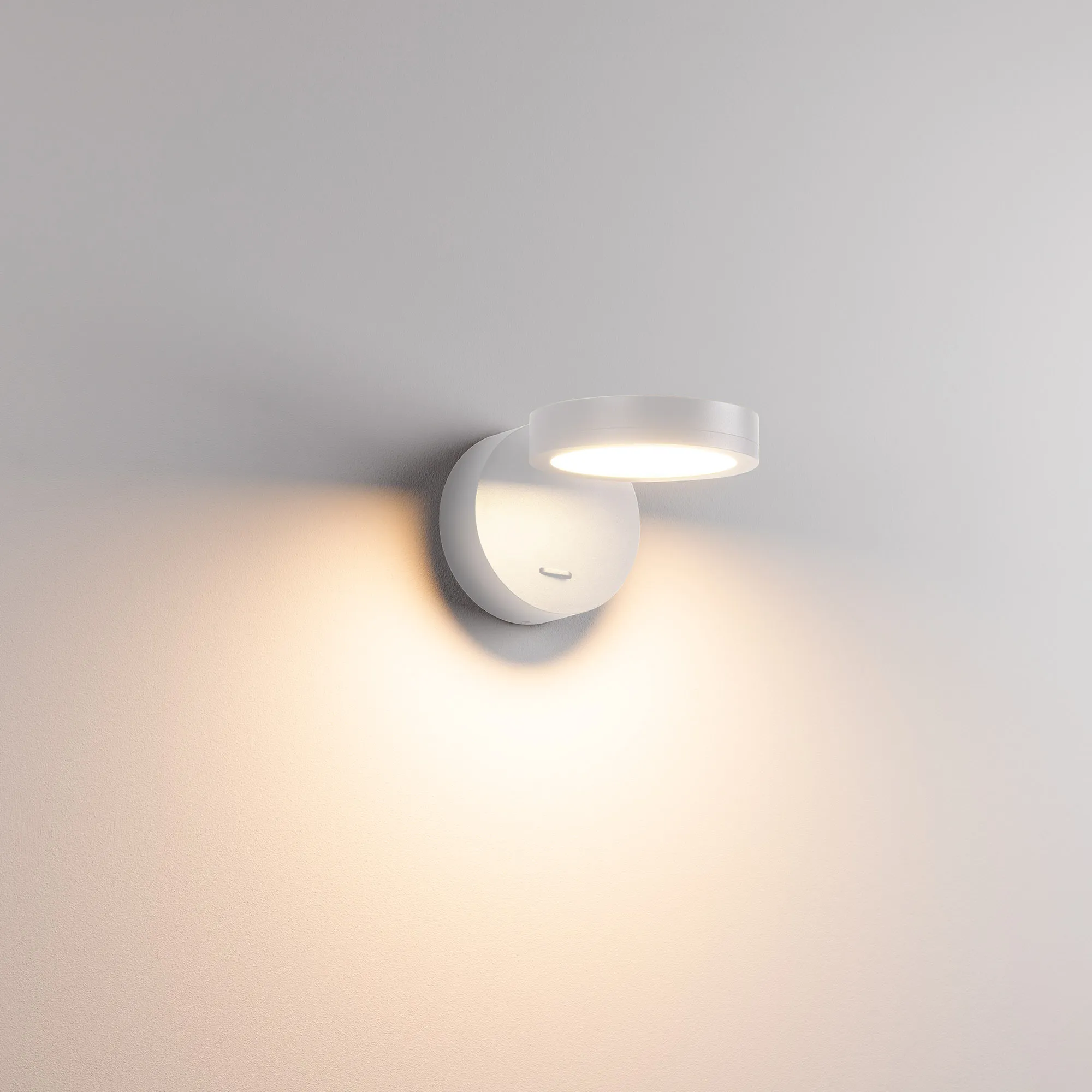 Накладной поворотный настенный светильник. Мощность 6 Вт, св. поток 360 лм, 60 лм/Вт, теплый 3000 K, CRI>90, угол 110°, напряжение питания 230 В. Белый круглый корпус из алюминия, степень защиты IP20. Размер основания Ø90 x 32 мм. Размер светоизлучателя Ø100 x 21 мм, угол поворота вокруг своей оси 350°. Монтаж накладной. Драйвер встроенный, 5 - 18В., 350мА, пульсация <1%.