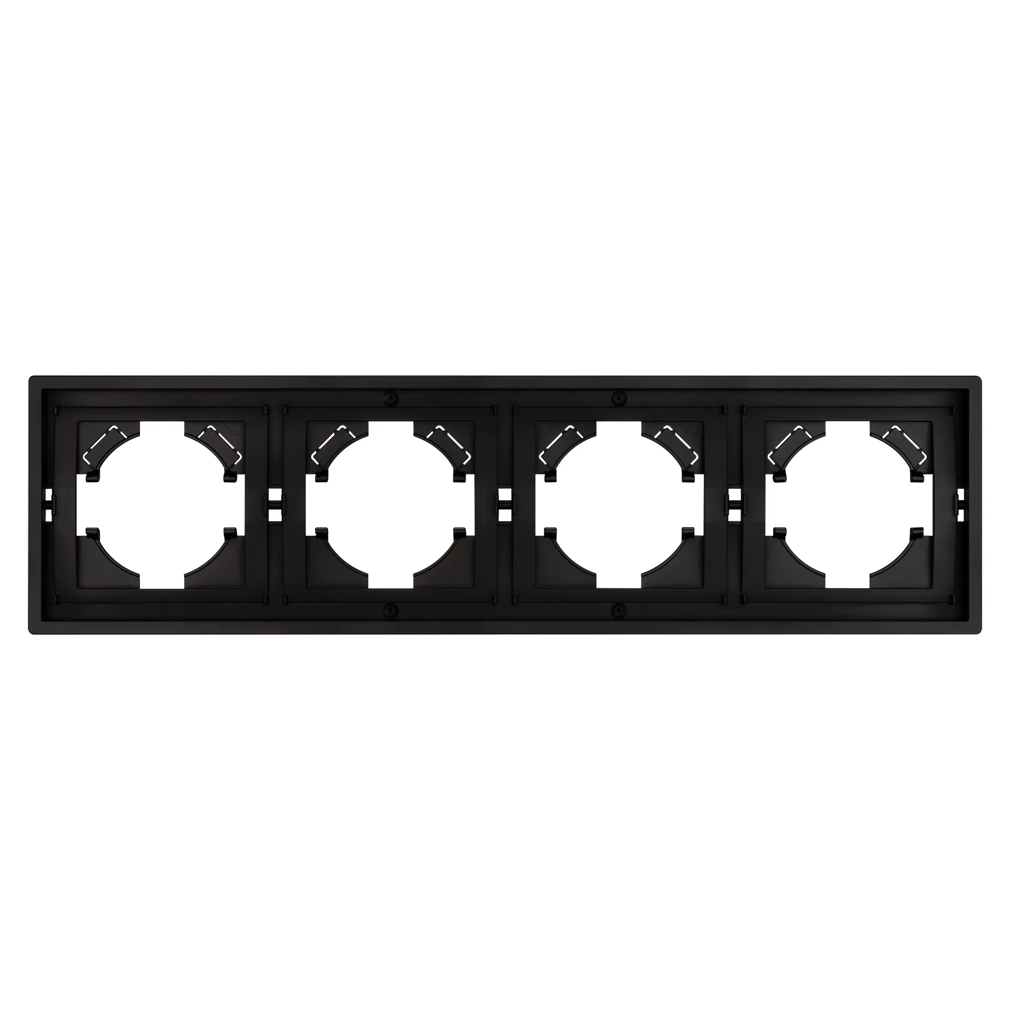 Рамка пластиковая на 4 поста, под встраиваемый механизм. Цвет - черный. Уровень герметичности IP20. Ориентация монтажа горизонтальная.